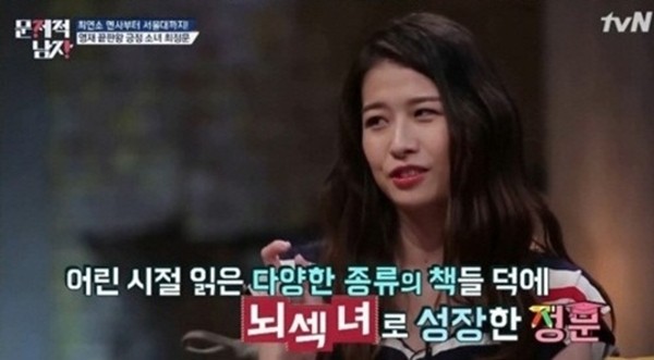 걸그룹 '티너스' 출신 방송인 최정문(24)의 이력인데요. 25일 방송된 tvN '뇌섹시대-문제적 남자'에서 뇌섹녀의 면모를 인증했습니다.