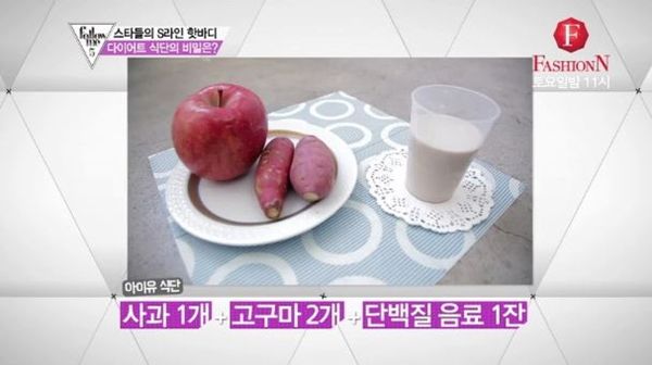 ① 아이유 : 드라마 촬영 중 갑자기 찐 살들을 빼기 위해 선택한 방법. 하루 동안 사과 1개+고구마 2개+단백질 음료 1잔을 나눠 마시면 된다.