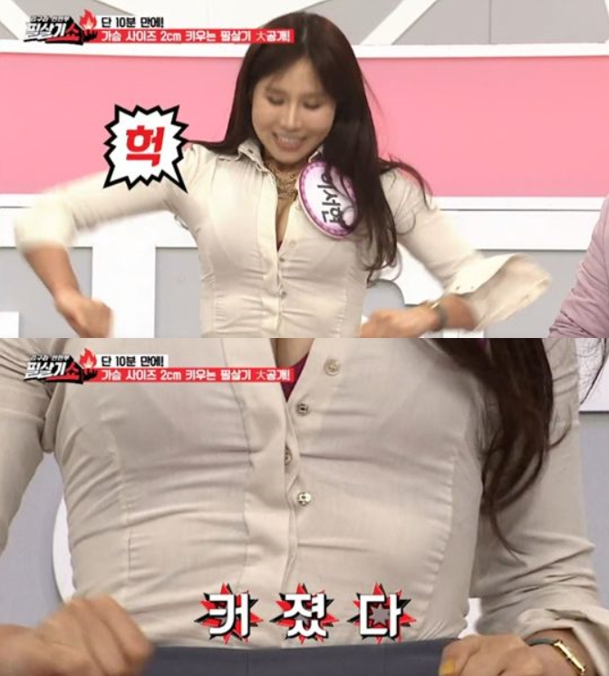 먼저 이서현은 이 운동을 소화하던 중 즉각적인 효과를 봤다. 블라우스 단추가 터져 버린 것. 측정 결과, C컵 (81.8cm)에서 풀 C컵(88cm)으로 변했다. 장영란도 이 운동의 수혜자다. 운동 전 가슴 둘레 86cm에서 운동 후 90cm로 변했다. 10분만에 4cm가 증가한 셈이다.