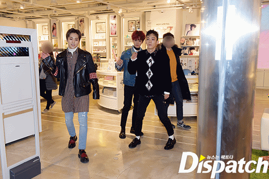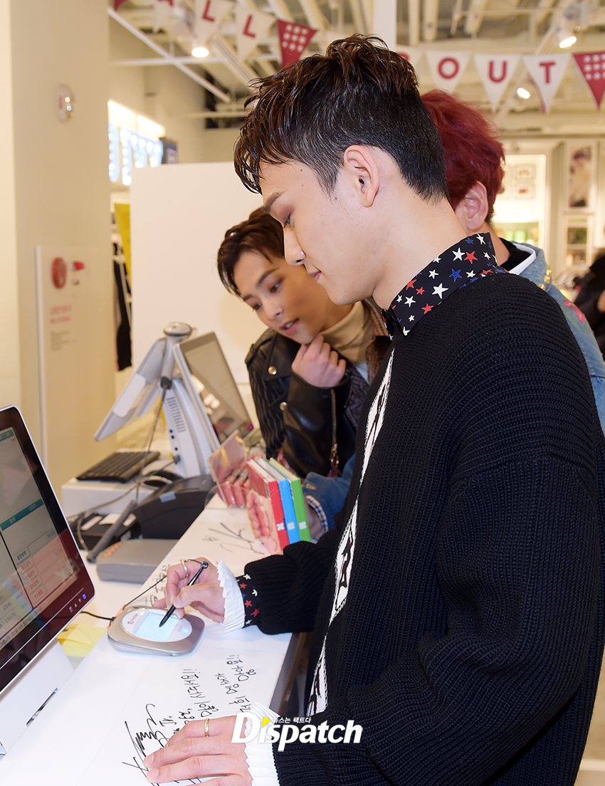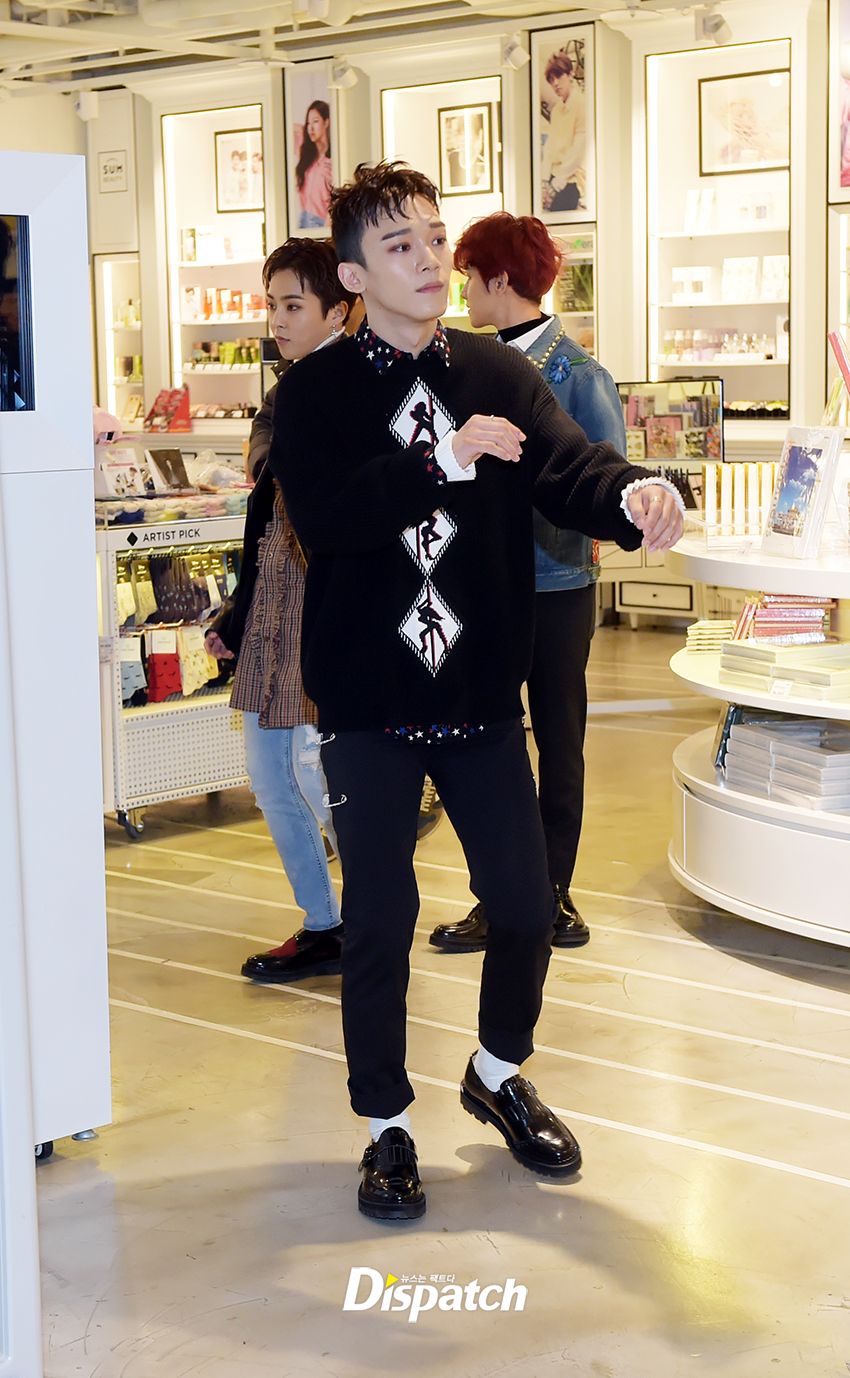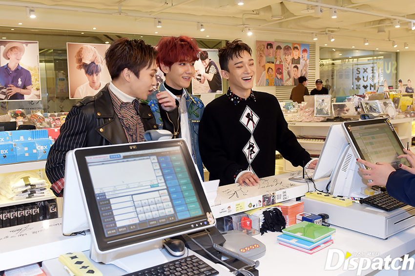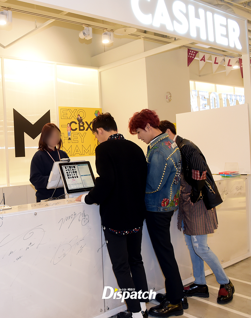 본격적으로 시작해봅시다. SM 굿즈샵 안입니다. 엑소의 손길이 바쁜데요. '헤이 마마' 재킷을 감상하고 있습니다. 보기만 해도 미소가 흐르죠?