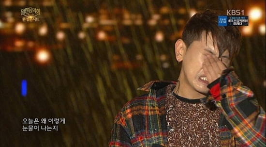 크러쉬는 비를 맞으며 열창했습니다. 옷이 흠뻑 젖고, 쏟아지는 비 때문에 눈 조차 제대로 뜨지 못했습니다.