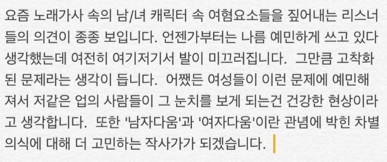 이후 그녀는 장문의 글을 올렸습니다. "요즘 노래가사 속의 남/녀 캐릭터 속 여혐 요소들을 짚어내는 리스너들의 의견이 종종 보인다"고 말문을 열었습니다.