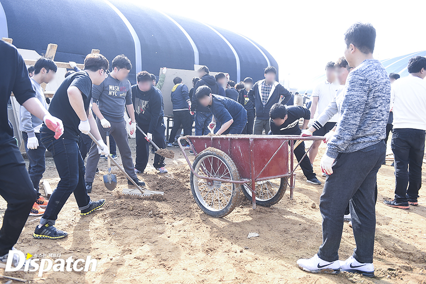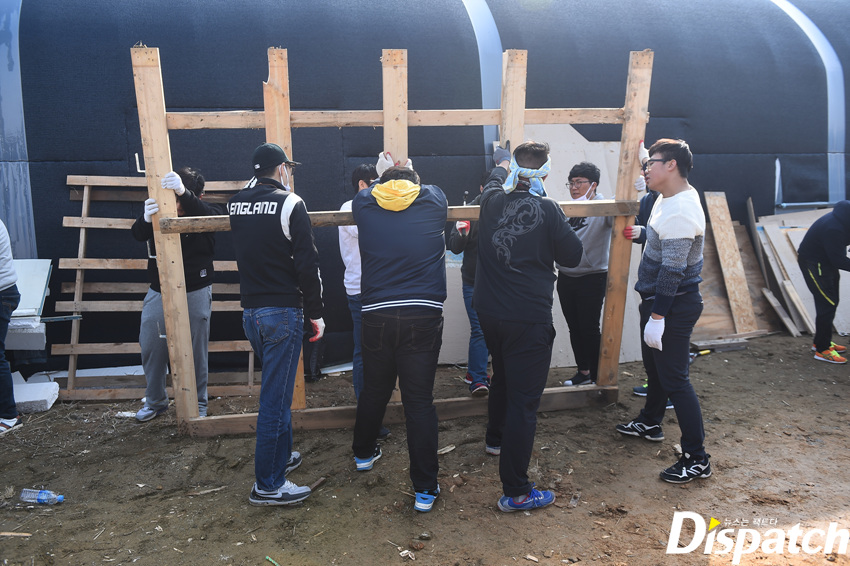러블리즈도 가만히 있을 수는 없죠. 팬들 사이에 섞여 열심히 일을 합니다. 목재를 사포로 곱게 갈고요. 깔끔하게 니스 칠을 했습니다.