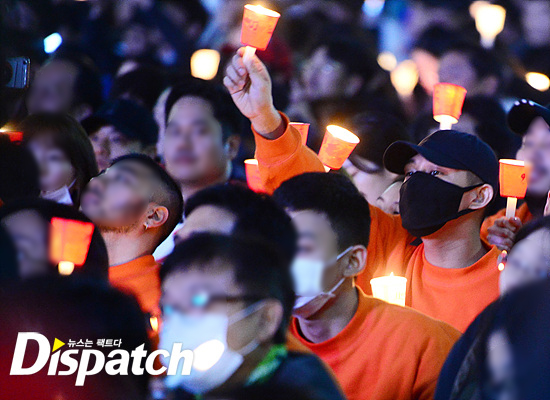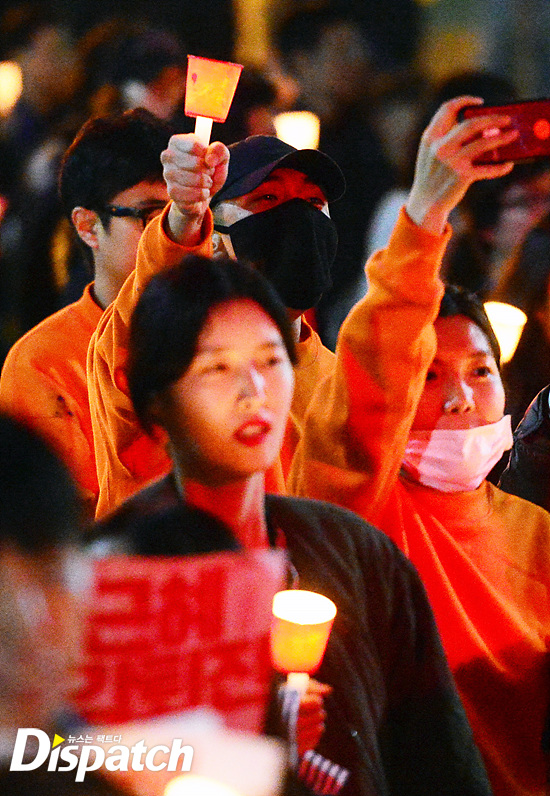 유아인이 19일 오후 광화문 '촛불집회'에 참석했다. 마스크로 얼굴을 가린 채 시민들과 발을 맞췄다.