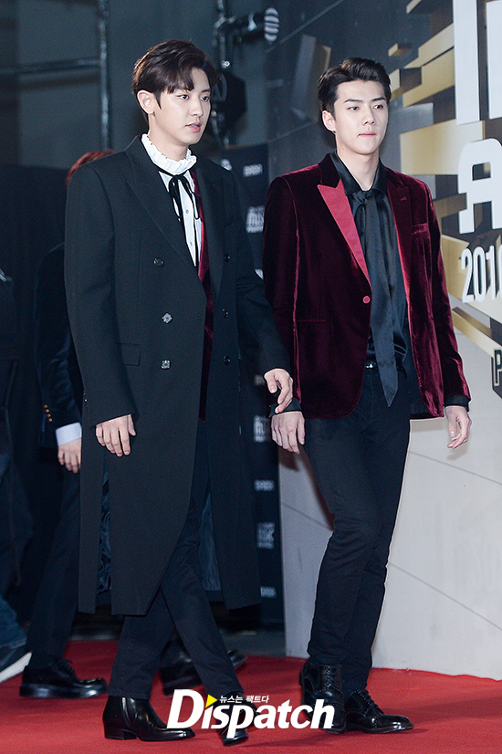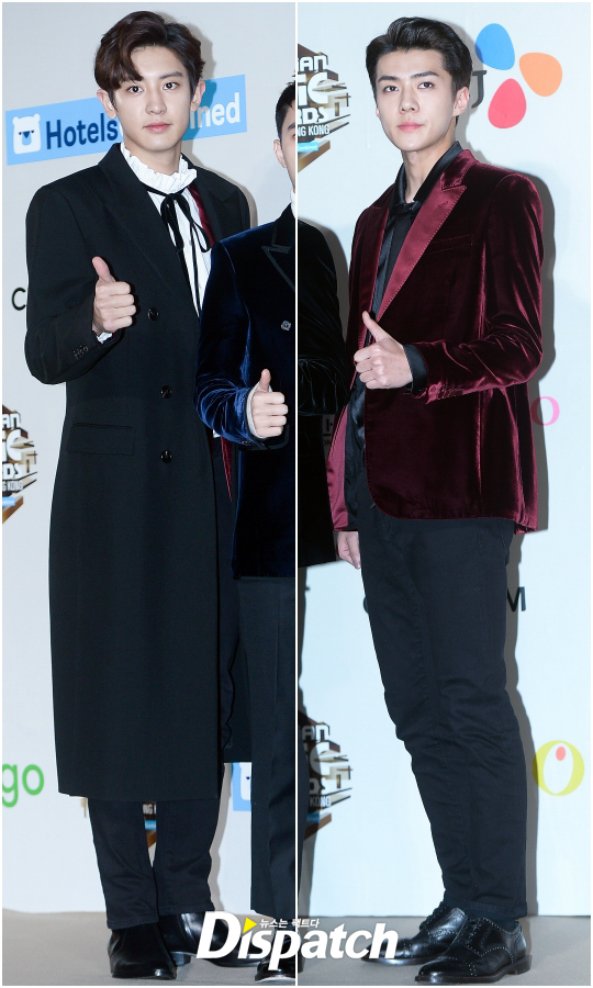이날 '엑소' 찬열과 세훈은 장신의 위엄을 선보였다. 찬열은 블랙 롱코트로 185cm 우월한 기럭지를 자랑했다. 세훈도 넘사벽 수트핏으로 181cm 신장을 입증했다.