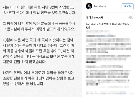 가수 헤이즈가 신곡 '저 별'의 표절 의혹에 대해 입을 열었습니다. 5일 자신의 인스타그램에 해명글을 올렸습니다.