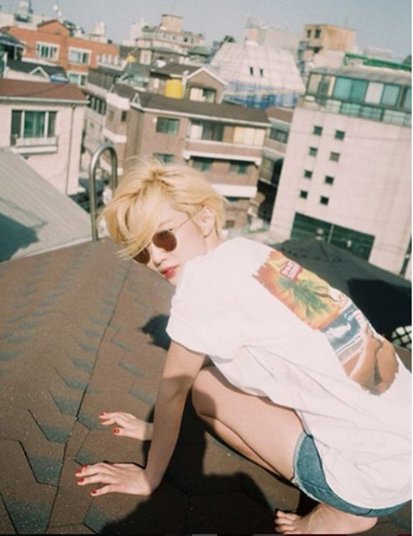 트레이드마크인 숏컷에 변화가 생겼습니다. 바로 밝은 노란 색으로 염색한 것인데요. 시크한 매력이 돋보였습니다.
