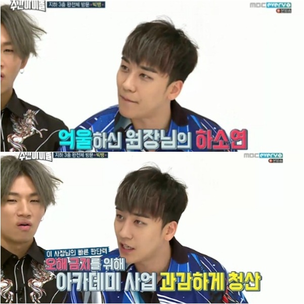 승리는 4일 방송된 MBC에브리원 '주간아이돌'에서 "최근 아카데미 사업을 정리했다"고 말했습니다.
