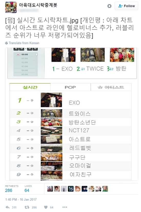 방탄소년단부터 레드벨벳, 트와이스, 아스트로, 우주소녀 등 '아육대' 녹화에 참여한 그룹들의 도시락을 평가했습니다. 심지어 차트까지 제작했죠.