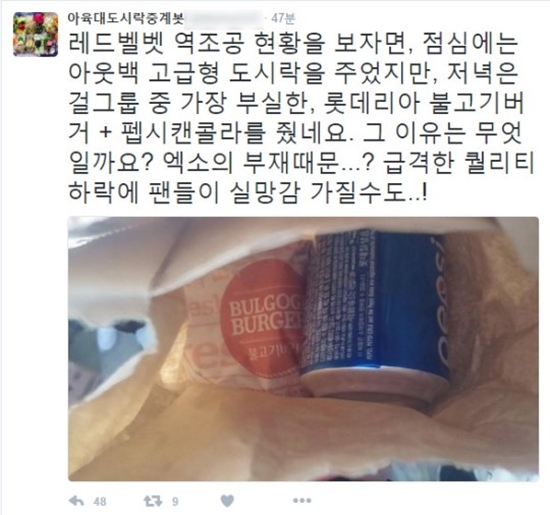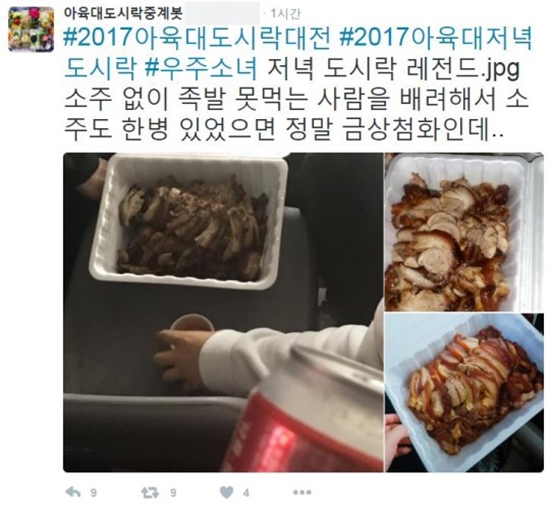 이날 이 트위터 사용자는 '아육대 도시락 중계봇'이라는 계정을 만들었는데요. 팬들의 도시락 인증샷을 바탕으로 나름의 품평(?)을 했습니다.