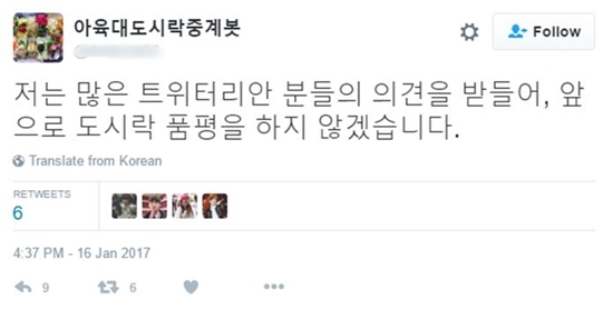 결국 트위터 사용자는 "많은 트위터리안 분들의 의견을 받들겠다. 앞으로 도시락 품평을 하지 않겠다"는 트윗을 남기고 사라졌습니다.