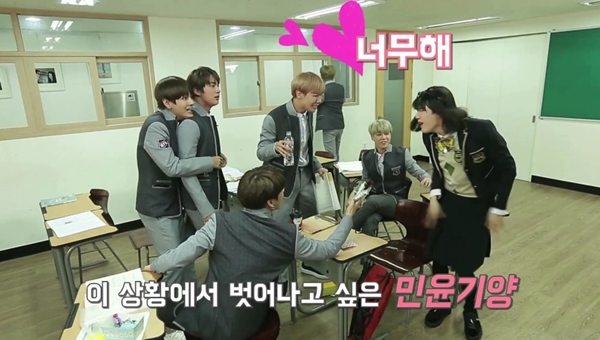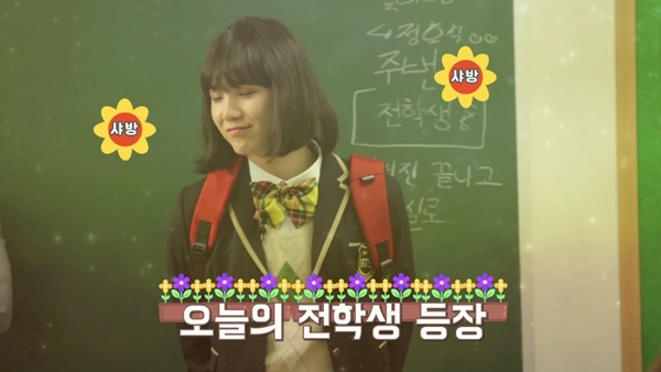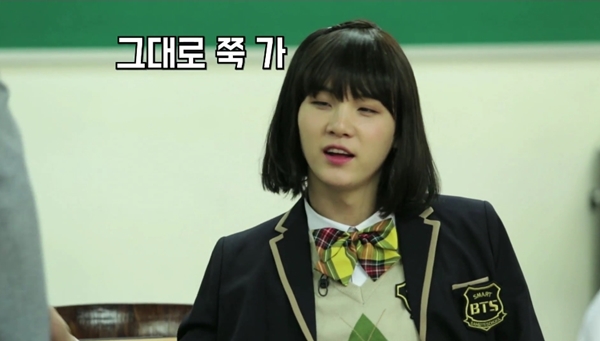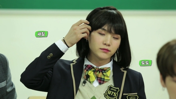 슈가는 새로 전학온 여고생역을 맡았습니다. 이에 여자 교복을 입고, 단발 머리 가발을 착용했죠. 그는 새침한 여고생으로 변신, 팬들을 놀라게 했습니다.