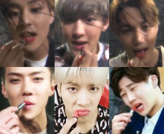 여기 입술도장 찍기 위해 립스틱을 바르는 아이돌들. 신기하게도 여자 형제가 있는 아이돌과 그렇지 않은 아이돌은 차이가 납니다.