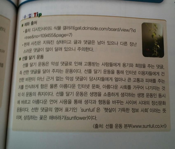 한편 교과서에는 예화 출처도 적혀있습니다. 현재 사진은 지워진 상태고, 글은 남아있으나 장난스러운 댓글이 많으니 주의하라는 내용입니다.