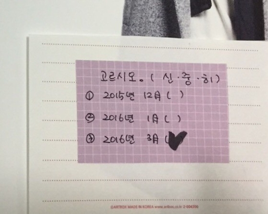 메모지 안에는 결혼식 날짜가 적혀있었습니다. 팬은 이민호에게 결혼식 날짜를 골라달라고 했는데요. '신.중.히'라는 문구로 간절함을 더했죠.