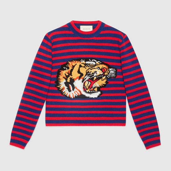 아이유가 입은 옷은요. 스트라이프 줄무늬가 돋보이는 니트 탑이었는데요. 가슴에 큰 호랑이 무늬가 달려있는 것이 특징입니다.