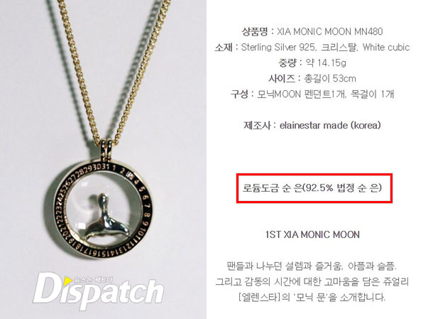 '시아 모닉문'은 92.5% 순은으로 이루어져 있다. 중량은 약 3.773돈(14.15g). 여기에 14K 골드로 도금했다. 2월 3일을 기념해 3자에 큐빅 1개를 박았다.
