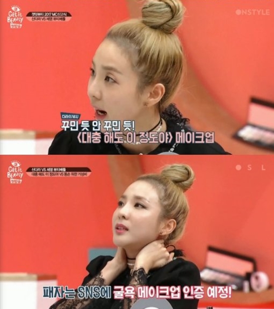 19일 방송된 온스타일 '겟잇뷰티 2017'에서는 산다라박이 MC 신고식을 치렀습니다. 바로 민낯 상태에서 셀프 메이크업을 하는 것이었는데요.
