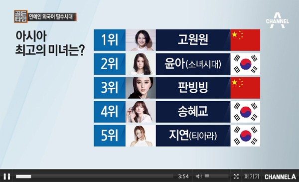중국 최대 포털 사이트 '바이두'에 따르면, 윤아는 지난 해 5월 '아시아 10대 미녀' 투표에서 2위에 올랐습니다. 중국 배우 고원원을 맹추격했죠.