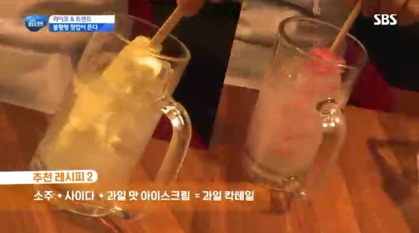 일명 '캔디바 주'도 있습니다. 소주와 사이다를 섞은 다음, 과일맛 아이스크림을 넣고 마시면 되는데요.