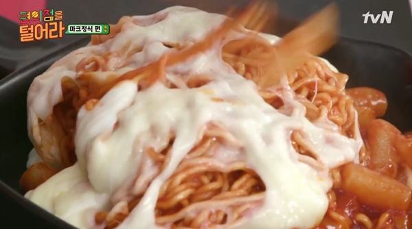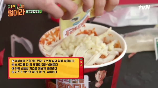'마크 정식'에는 인스턴트 스파게티와 떡볶이, 소세지와 치즈가 들어가는데요. 이 역시 편의점 포장마차에서 직접 만들어 먹을 수 있습니다.