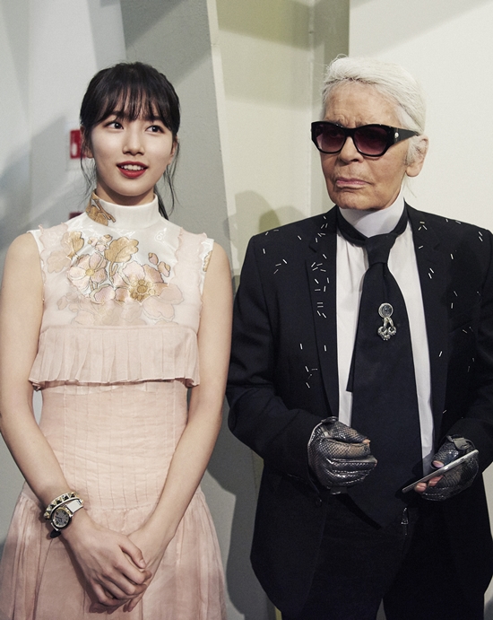 이날 수지는 패셔니스타다운 면모를 과시했다. 패션 거장 칼 라거펠트와 만났다. 두 사람은 인증샷을 찍으며, 만남을 기념했다.
