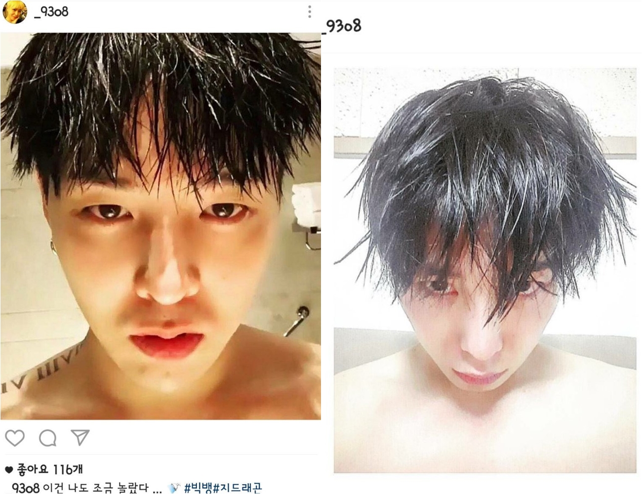 또 지드래곤의 사진과 자신의 사진을 비교하기도 했는데요. 샤워 후 촬영한 셀카 모습을 같이 올리며 스스로 싱크로율을 비교하기도 했습니다.