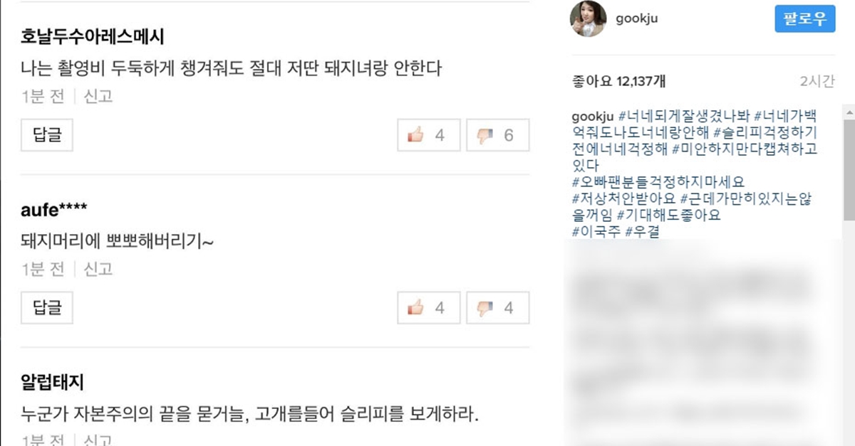악플러들은 이국주의 외모를 비난했습니다. "촬영비 두둑하게 챙겨줘도 절대 저런 돼지랑은 안 한다", "누군가 자본주의의 끝을 묻거늘, 고갤 들어 슬리피를 보라"는 말도 있었죠.