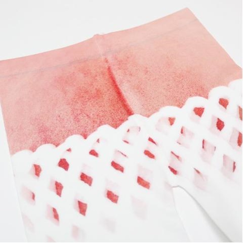 다리 부분은 여느 핑크 스타킹과 달라 보이지 않습니다. 다만 양쪽 발끝에 핑크색이 살짝 들어가 있고, 한쪽 발엔 복숭아 잎이 그려져 있습니다.