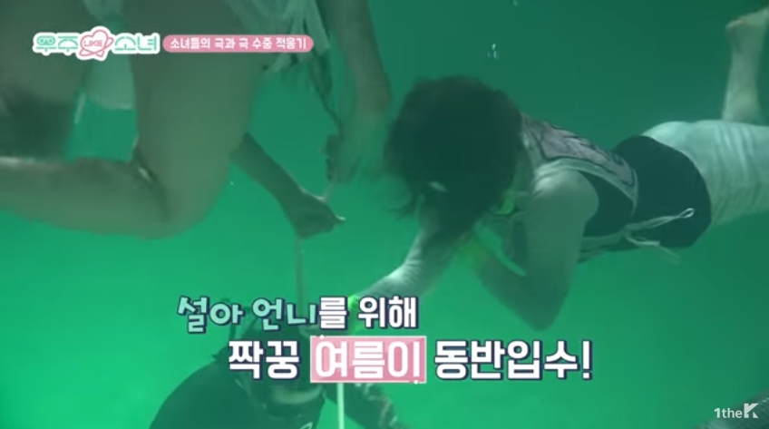하지만 포기는 없었습니다. 설아는 다시 수조로 들어갔죠. 하지만 처음부터 성공하기란 쉽지 않았습니다. 멤버 여름은 설아가 무서워하지 않도록 함께 밧줄을 잡고 들어갔습니다.
