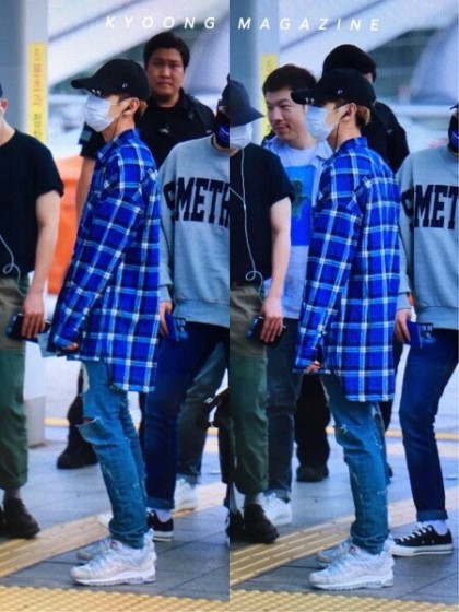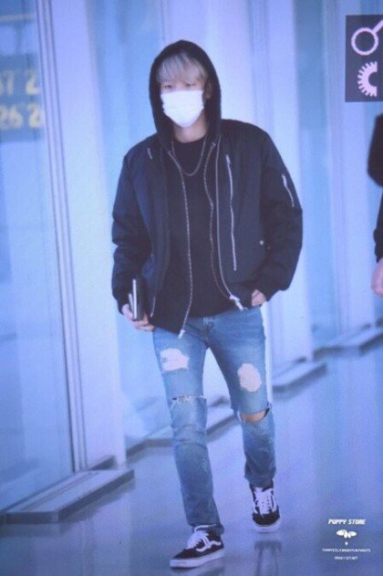지난 2015년과 2016년 백현은 같은 바지를 입고 공항에 등장했습니다. 먼저 2015년 사진을 볼까요? 네이비 후드 집업을 입고 디스트로이드 진을 입고 있습니다.