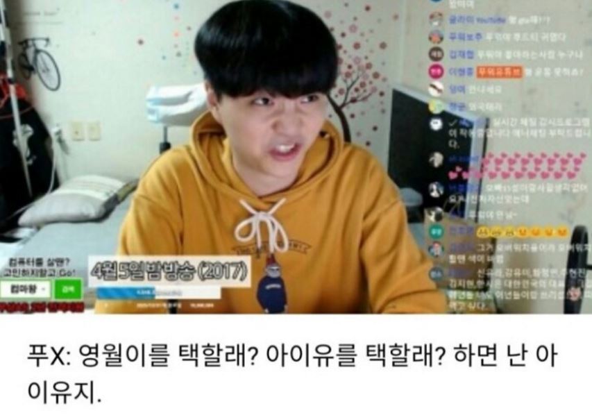 이 BJ는 지난 5일 자신의 유튜브 방송에서 "영월이(자신의 반려견)를 택할래? 아이유를 택할래? 하면 난 아이유"라고 말했습니다.