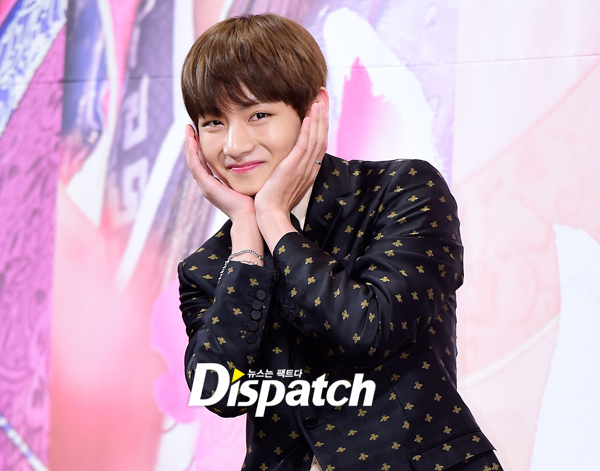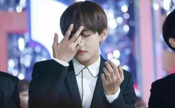뷔의 넘사벽 소두는 꽃받침 포즈를 할 때 더 강조됩니다. 손을 펴서 얼굴을 가렸는데요. 한 손만으로도 가려질만한 크기네요.