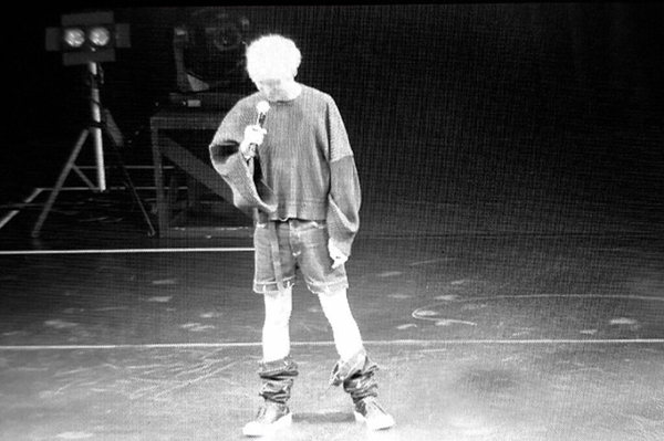 강승윤은 무대 위로 올라가 팬들과 인사했습니다. 손을 흔들며 몸을 움직였죠. 그러면서 바지의 아랫부분이 내려갔습니다.