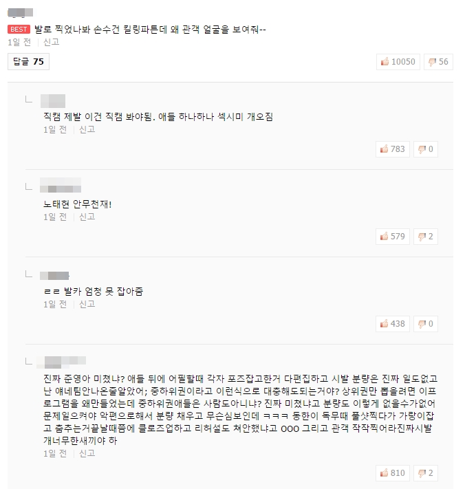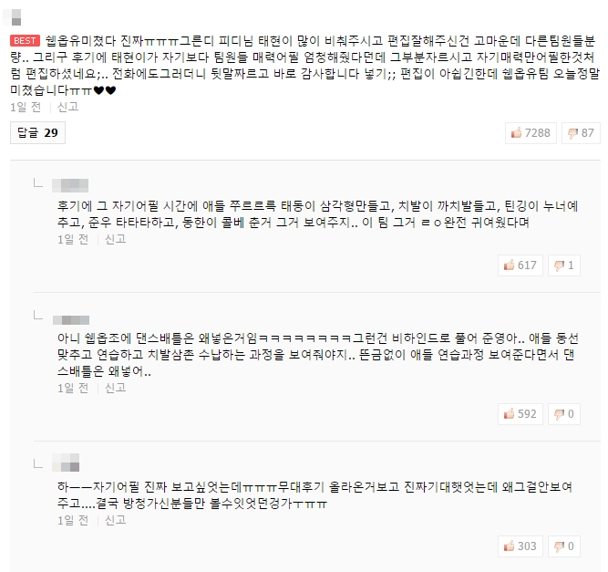 네티즌들은 "무대 후 자기어필 시간도 편집됐다"고 주장했습니다. 또 "댄스배틀은 비하인드에 넣어야 했고, 멤버들의 연습 과정을 상세히 담았어야 했다"고 덧붙였죠.