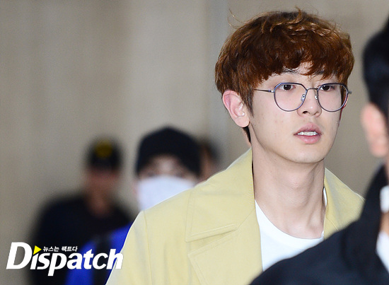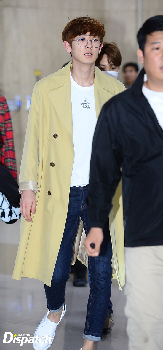 찬열은 옐로우 컬러의 트렌치 코트와 데님진을 매치했다. 곱상한 외모와 우월한 비율도 돋보였다.
