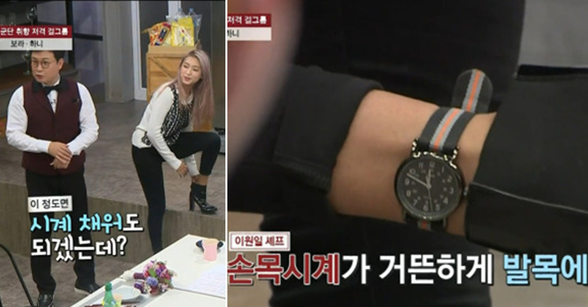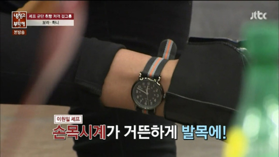 보라는 이원일 셰프의 손목 시계를 발목에 채우는 것에 도전했습니다. 그 결과는? 너무나 쉽게 채워지는군요.