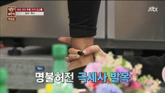 보라의 발목은 웬만한 남자 손목 굵기 정도였는습니다. 이에 MC 김성주는 "시계 채워도 되겠다"고 말했죠.