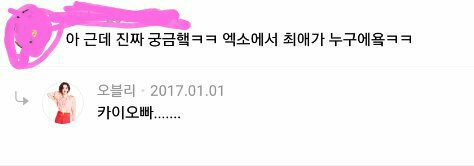 팬카페에서는 자신의 최애(가장 좋아하는 멤버)를 밝히기도 했습니다. "진짜 궁금하다. 엑소의 최애가 누구냐"는 팬의 질문에 "카이오빠"라고 답해 웃음을 자아냈습니다.