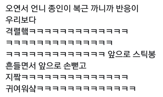 그리고 최근에는요. 엑소 콘서트에 모습을 드러내기도 했습니다. 생생한 후기도 있었는데요. 팬피셜, "카이가 복근을 까니 우리보다 격렬한 반응을 보였다"고 합니다. 그녀의 엑소 사랑, 정말 최고네요.