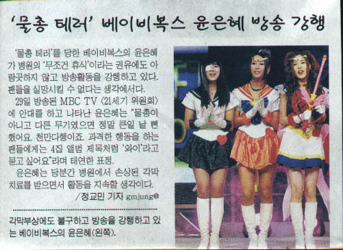 간미연만 당한 것이 아니었습니다. 베이비복스의 공연장에 스태프로 위장한 한 여성은 물총에 오물을 넣어 간미연과 윤은혜를 테러했습니다. 그래서 윤은혜는 각막부상을 당하고 말죠. 당시 그의 나이는 16세.