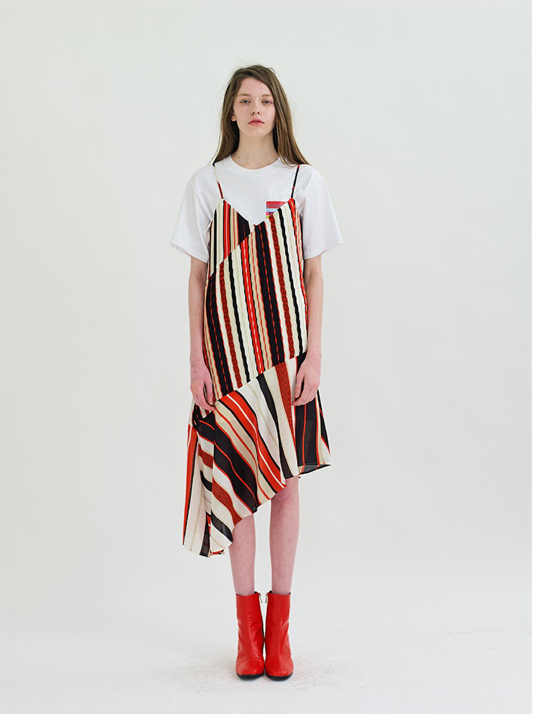 뷔스티에 원피스를 입었습니다. 굵고 얇은 세로 스트라이프 패턴이 들어간 제품인데요. 랩 형태로 돼 있어 은근한 여성미가 감돌았습니다.