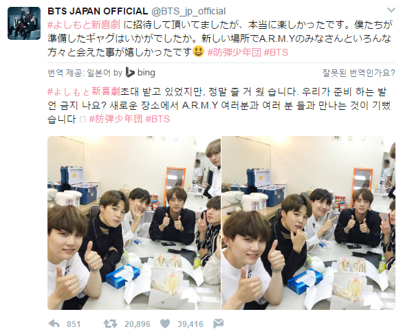 2일에는 오사카 남바서 열린 요시모토 희극에 게스트로 출연했다. 관객들은 방탄소년단의 연기에 환호성과 함께 박수를 보냈다.