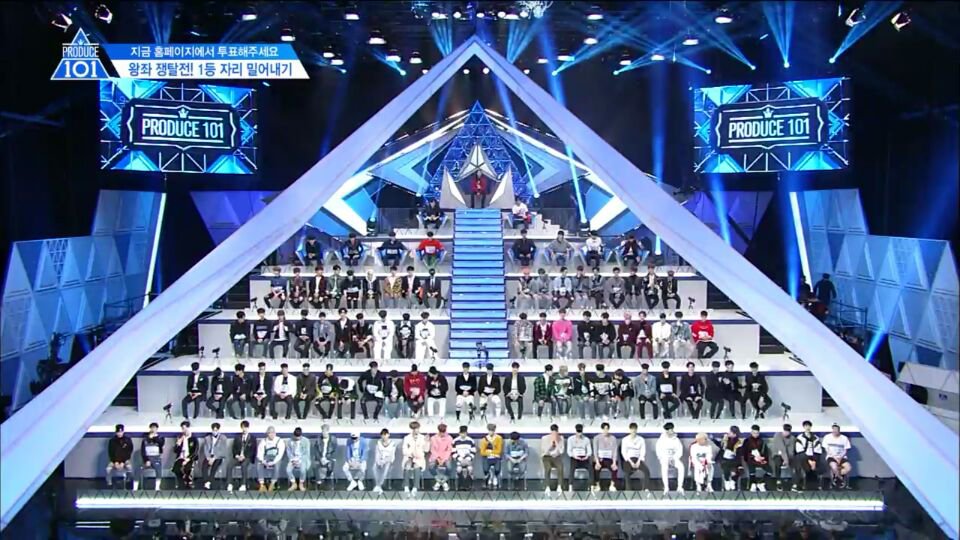 몆주마다 돌아오는 순위발표식도 같습니다. '프로듀스'는 시즌 1, 2회 모두 국민 프로듀서를 상대로 순위제를 진행했습니다. 여기엔 등수에 맞는 투명의자가 준비돼있고요. 1등은 가장 위 특별한 의자를 준비합니다.