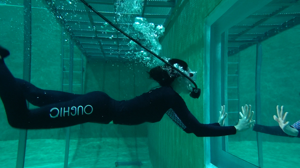 그러더니 실전에서도 단번에 7m 잠수에 성공했죠. 심지어 바닥에서 손까지 흔들어 모두를 놀라게 했습니다.