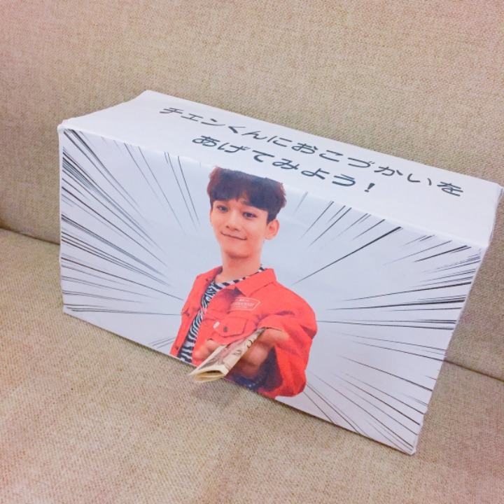 일본의 한 '엑소' 팬이 유쾌한 저금통을 만들었습니다. 첸에게 지폐와 동전을 건네주는 모양으로 제작했는데요.