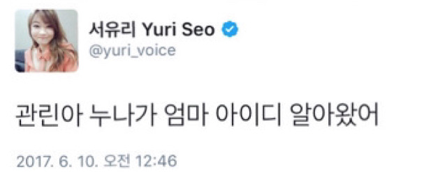 서유리는 10일 새벽 자신의 SNS에 짤막한 글을 남겼는데요. "관린아 누나가 엄마 아이디 알아왔어"라는 말로 웃음을 자아냈습니다.