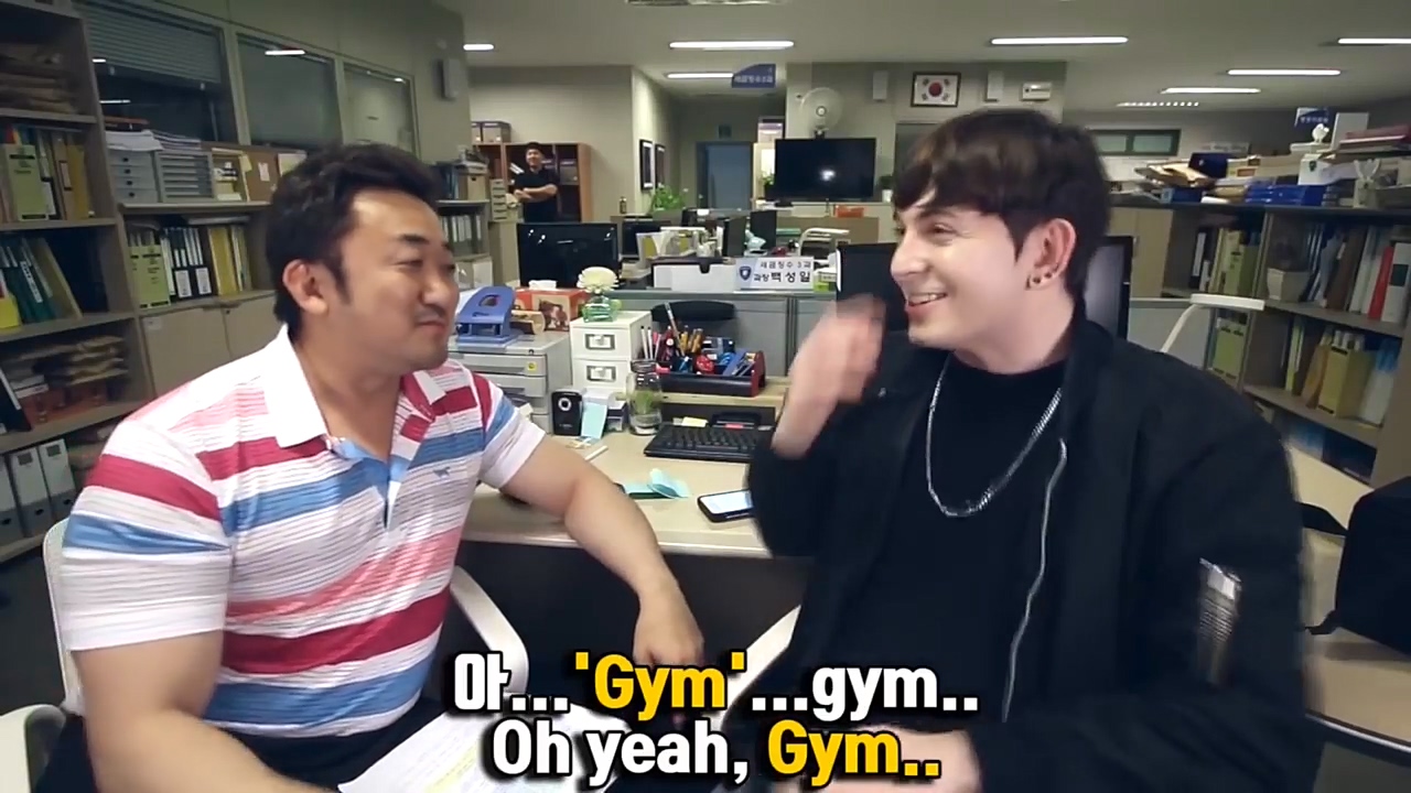 마동석은 "헬스는 한국말이다"며 미국식 표현방법을 알려줬습니다. 데이브도 몇 초 뒤 '짐'(Gym)이라고 정정하며 민망한 듯 웃음을 터트렸습니다.