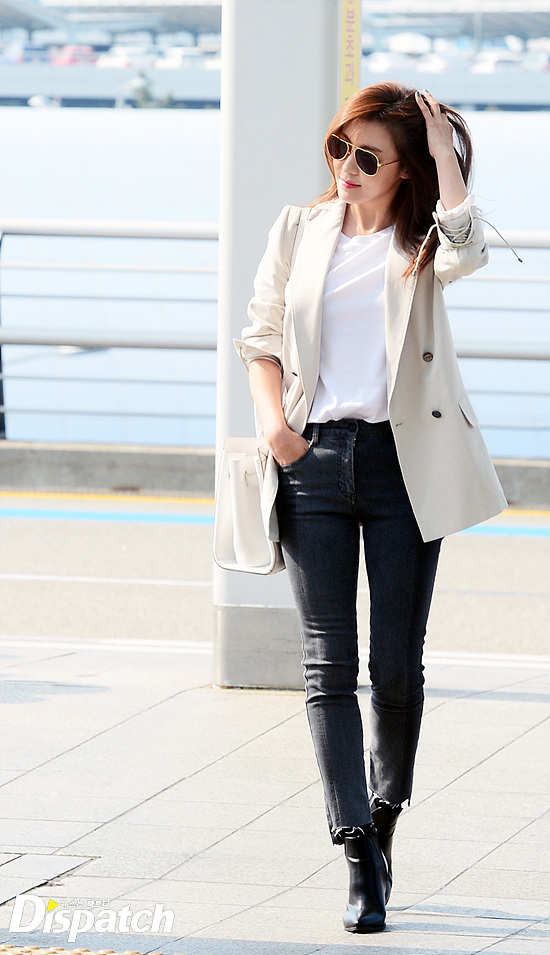 하지원은 베이지 컬러의 재킷과 스키니진으로 세련된 공항패션을 완성했다. 눈부신 햇살에도 청순한 비주얼이 돋보였다.
