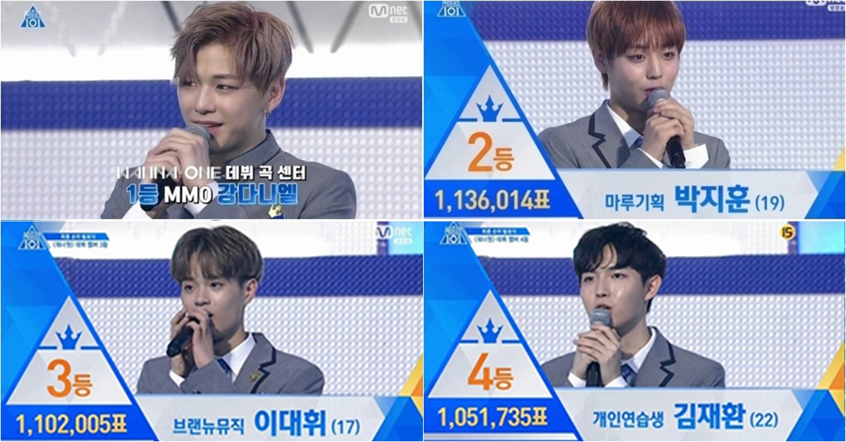 김재환(개인 연습생)은 4위였다. 105만 1,735표의 주인공이 됐다. 옹성우(판타지오)는 98만 4,756표로 5위에 올랐다.